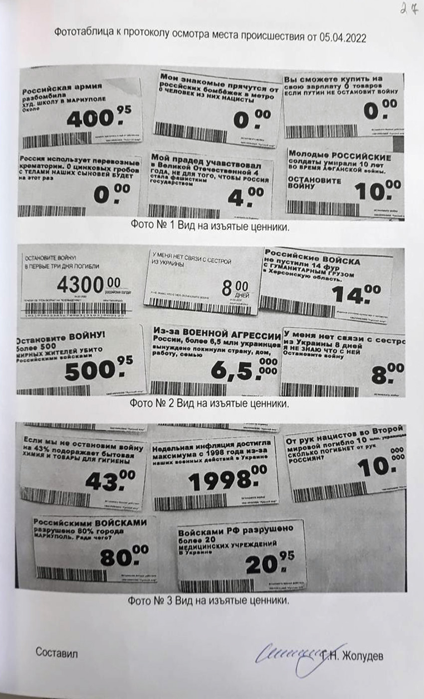 4 апреля Марина Ходорченко по вайберу отправила своей маме, Наталье Мизининой, фотографии нескольких ценников в смоленском магазине «Карусель». Вместо цен там были такие фразы: «Российская армия разбомбила худ. школу в Мариуполе!», «Остановите ВОЙНУ! В первые три дня погибли 4300 российских солдат. Почему об этом молчат на телевидении?».