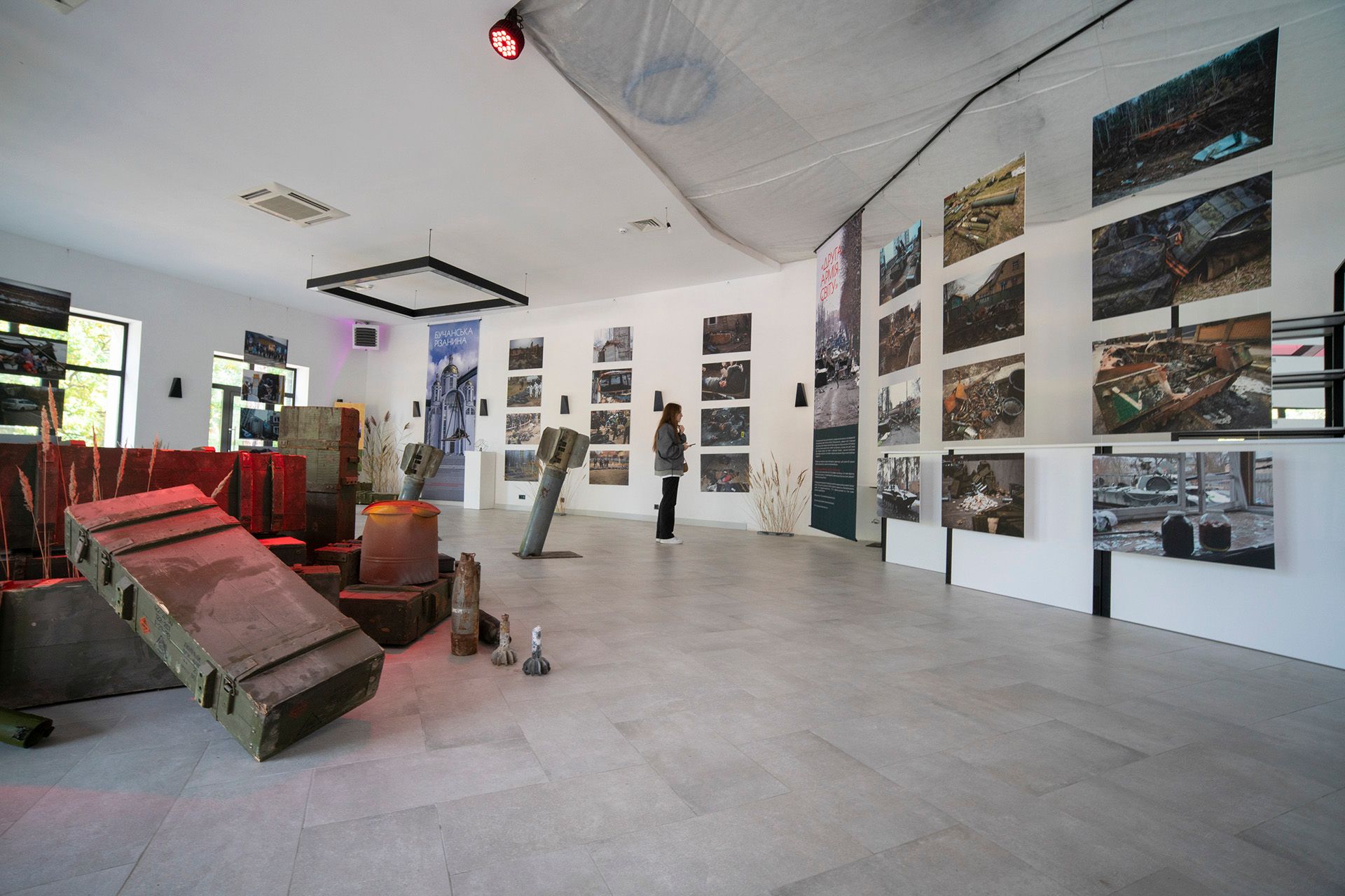 The photos are supplemented with objects like ammunition boxes, soldiers’ helmets, and a even small anti-tank obstacle — all things that were found in the Bucha streets, according to gallery owner Alina Kosenko.