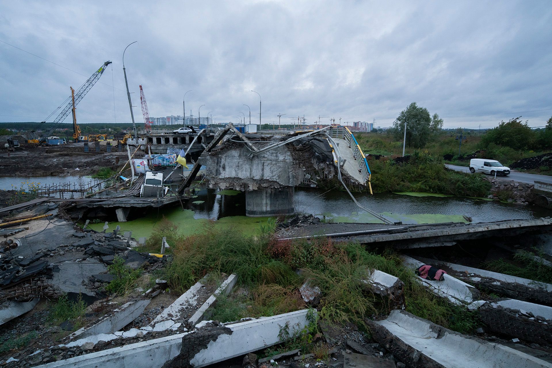 On February 25, Ukrainian forces blew up a bridge over the Irpin River to prevent the advancing Russian army from reaching Kyiv. In the months since, bright yellow flowers and tomato bushes have grown up around the concrete ruins.