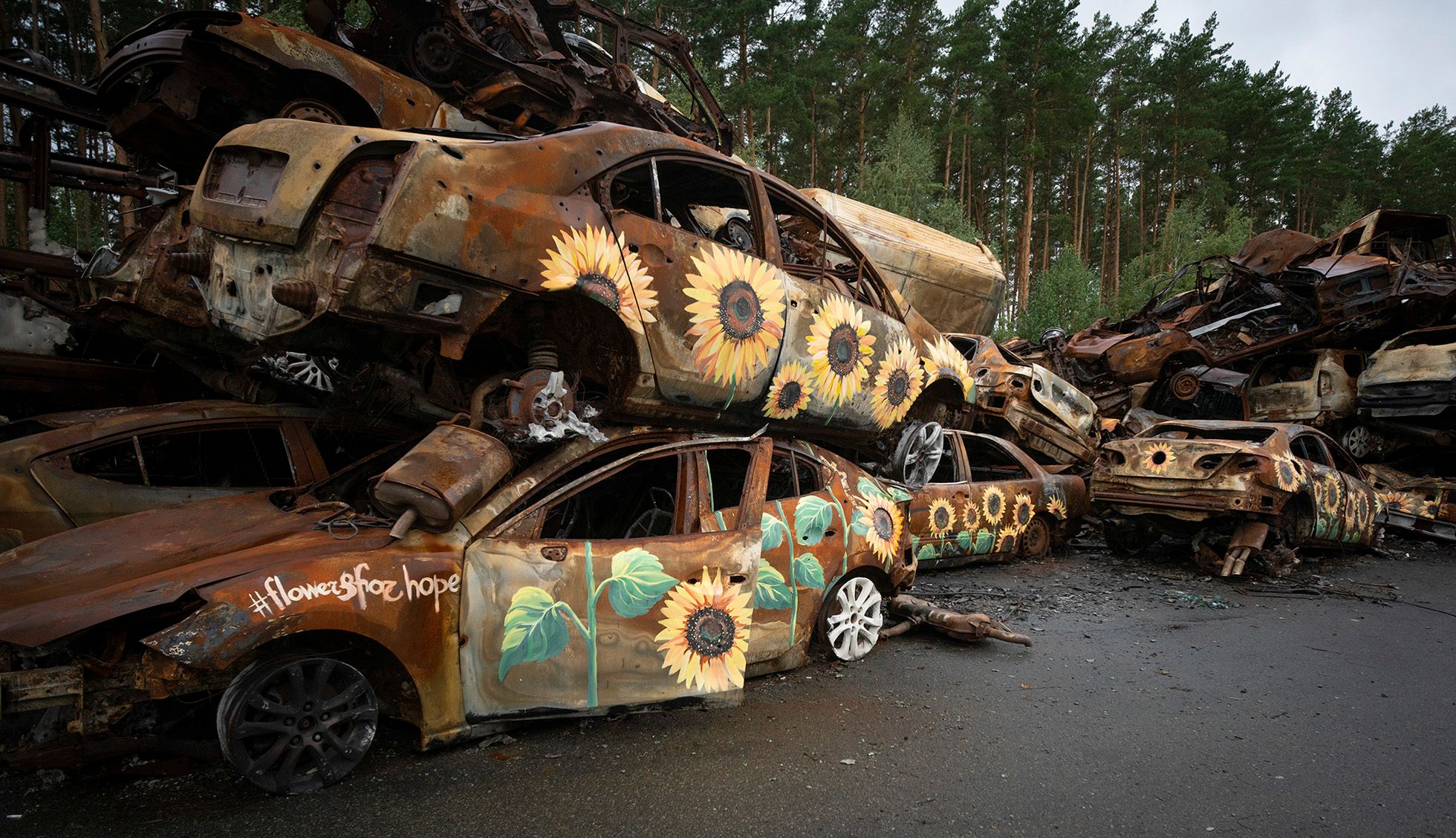 Some of the cars’ doors have sunflowers painted over them. As part of a project called Flowers for Hope, Ukrainian artists have used paintings like these to give meaning to the war. The sunflower, the movement’s main motif, is a symbol of Ukrainian resistance and hope.