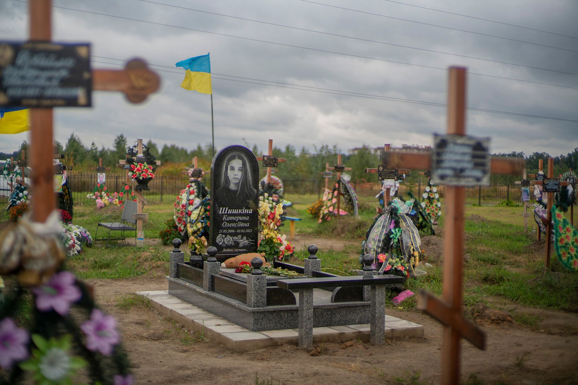 Nelya shows me the way to the city cemetery. It begins with a row of fallen soldiers. Ukrainian flags fly over the fresh graves, which are covered in wreaths and flowers.