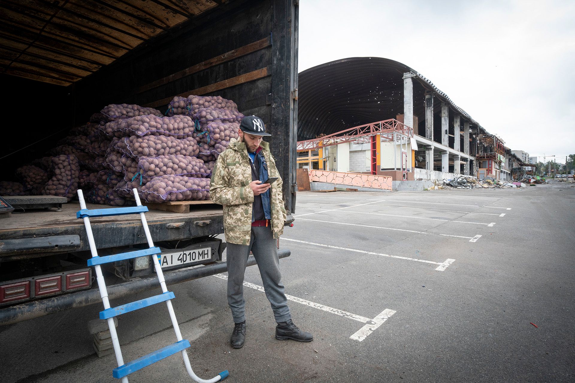 Next to the building’s “skeleton,” an Irpin resident named Valery is selling potatoes out of a truck, though there don’t seem to be any customers around. When asked why he’s all alone, Valery smiles. “This is the old wholesale market. Well, I say market, but it was more of just a crowded spot. When Giraffe was still operating, a lot of people came here to buy and sell vegetables.”