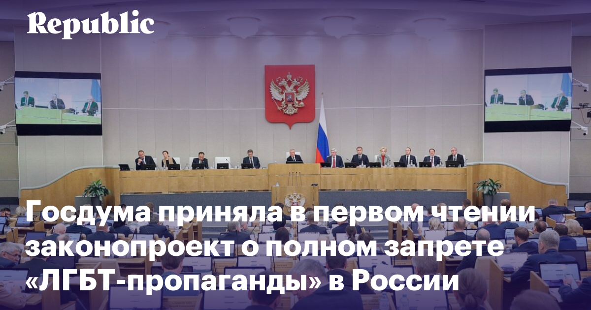 Госдума сегодня единогласно приняла в первом чтении законопроекты о запрете «пропаганды нетрадиционных сексуальных отношений» в СМИ, литературе, интернете, рекламе и кино. По мнению российских депутатов, Запад использует идеологию «отрицания семейных ценностей» для порабощения стран, в пропаганде ЛГБТ, педофилии и смены пола скрыта угроза смены власти в России. Инициатива вводит серьезные штрафы — до 10 миллионов рублей.
