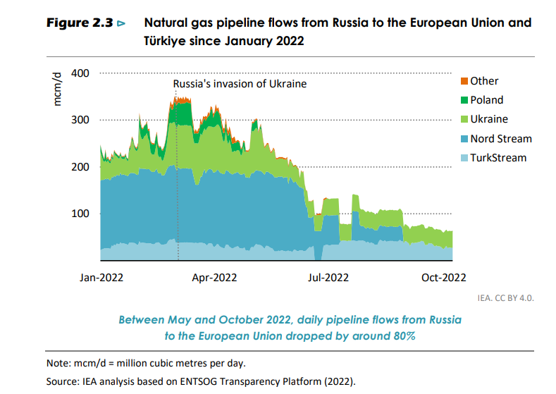 - Перспективы российского энергетического экспорта, описываемые МЭА, печальны. Россия указывалась в числе проигравших от мирового энергоперехода и раньше, но дешевизна российских поставок позволяла сгладить этот эффект. Но война все изменила. Единственная возможность для России переориентировать выпадающие из-за санкций поставки — это Китай, но полностью заместить Европу он не сможет, особенно в части газа. По оценке МЭА, в 2020-е годы потребление газа в Китае будет в среднем расти на 2% ежегодно (в 2010-е оно росло на 12% в год). По сравнению с отчетом от 2021 года МЭА снизило прогноз объемов добычи нефти в России к 2025 году на 2 млн баррелей в сутки, добычи природного газа — на 200 млрд кубометров в год. Сейчас с газом происходит настоящая катастрофа — после перекрытия «Северного потока» российский экспорт трубопроводного газа упал на 80%.