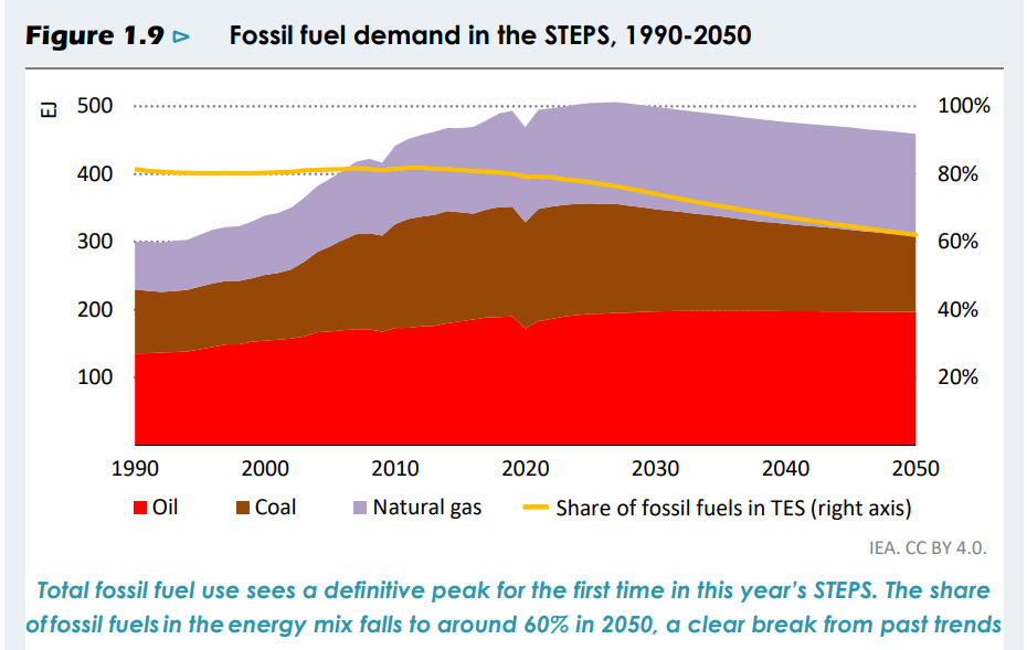 - Описанный в докладе базовый сценарий МЭА предполагает, что около 2025 года мировой спрос на ископаемое топливо пройдет пик, после которого начнет падать. Это первый сценарий в истории прогнозов МЭА, в котором просматривается выход на пиковую точку или плато спроса на каждый из трех главных видов ископаемого топлива — уголь (уже через несколько лет), газ (к концу 2020-х) и нефть (к середине 2030-х). Доля ископаемого топлива в общем потреблении энергии, долгое время сохранявшаяся на уровне 80%, начнет падать — до 75% к 2030 году и до 60% к 2050-му.