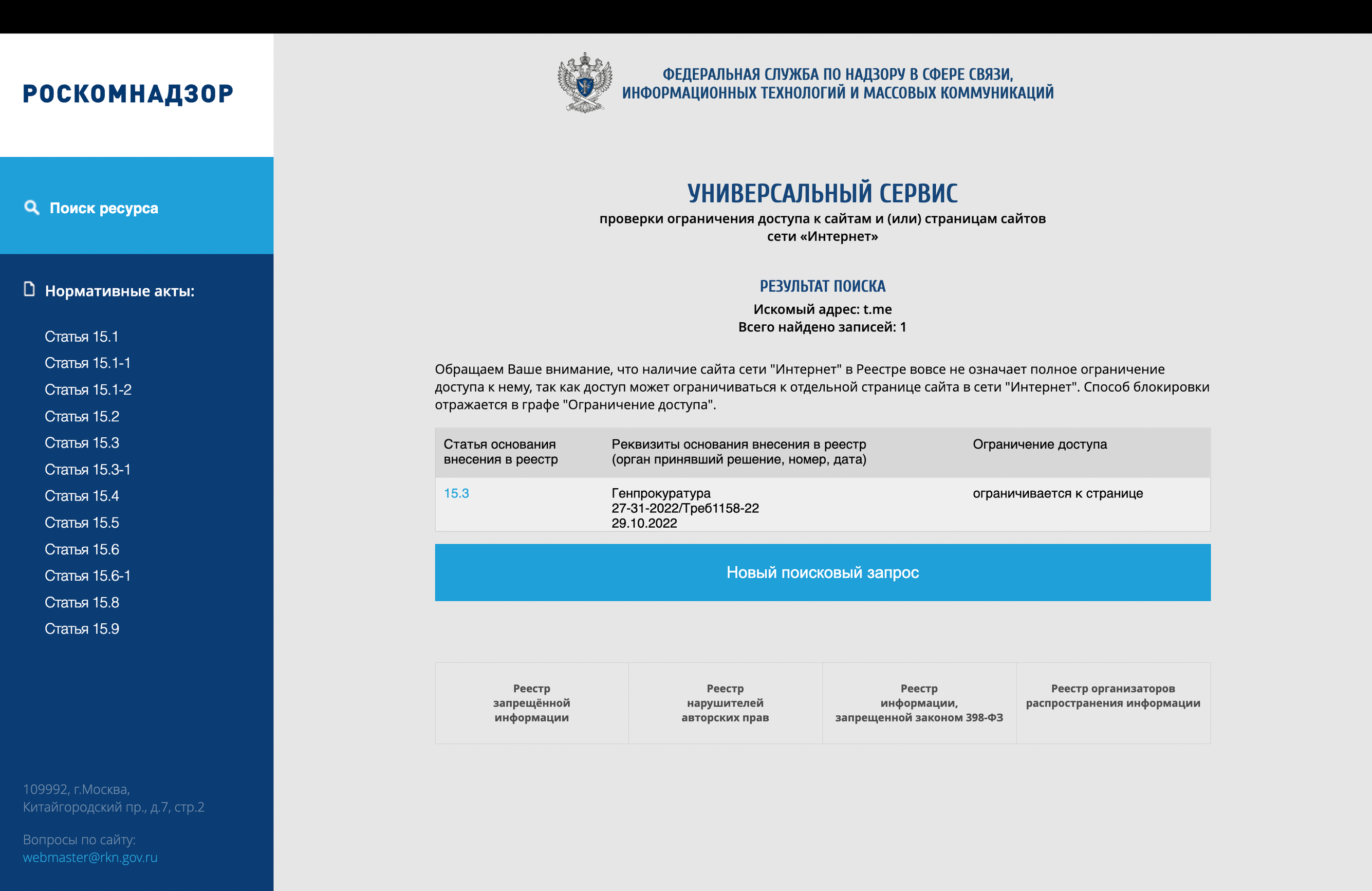 The agency’s reasons for blocking the t.me domain are unknown. According to Roskomnadzor, access to t.me is limited by the Prosecutor General’s office on the basis of Article 15.3 of the law on information (Procedure for Restricting Access to Unlawfully Distributed Information).