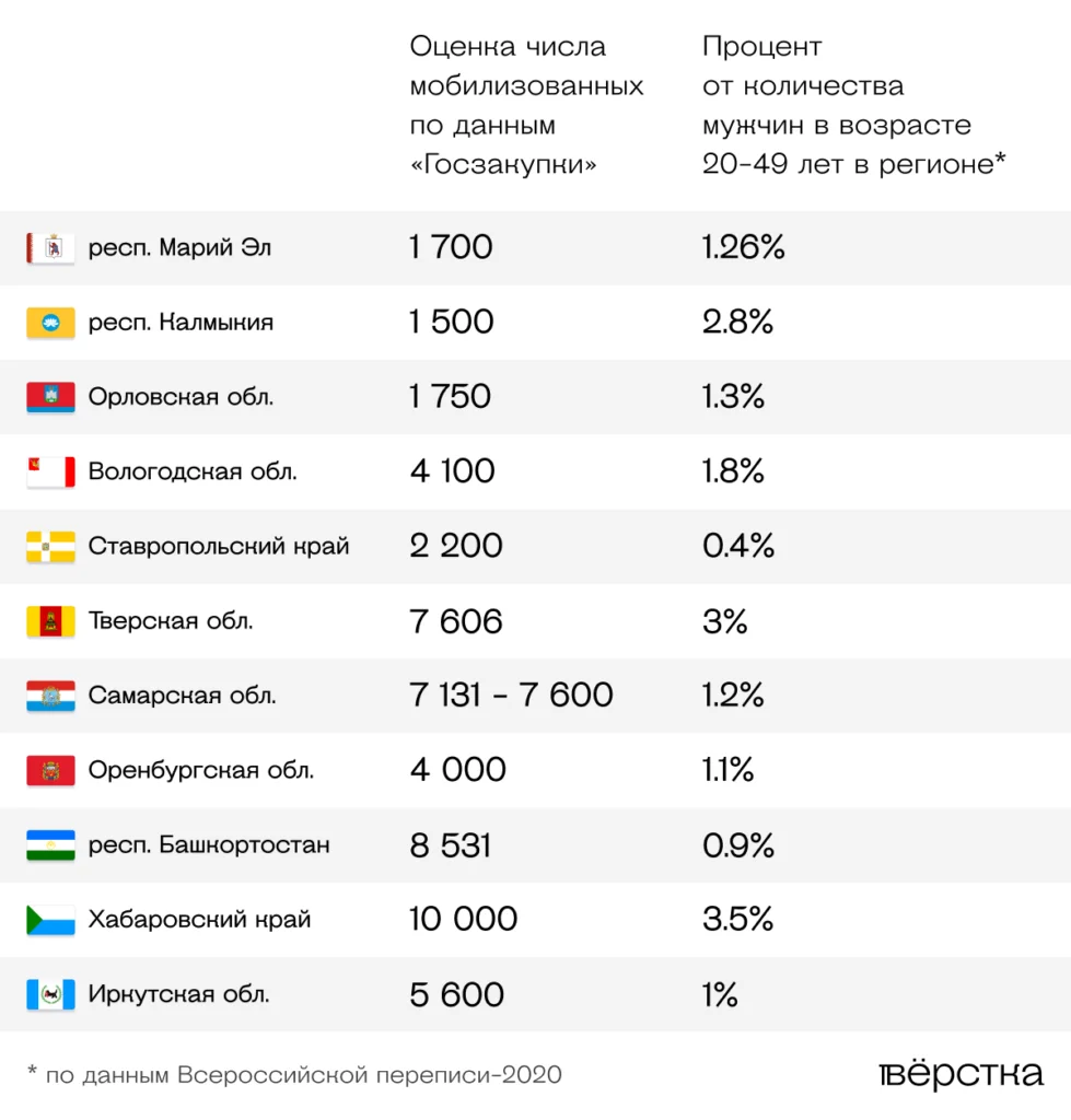 Для расчёта «Вёрстка» использовала данные Всеобщей переписи населения 2020 — 2021 года. За число мобилизационного ресурса принято общее число мужчин в регионе в возрасте от 20 до 49 лет. Именно в этом возрасте призывают самую массовую категорию — рядовых и сержантский состав.