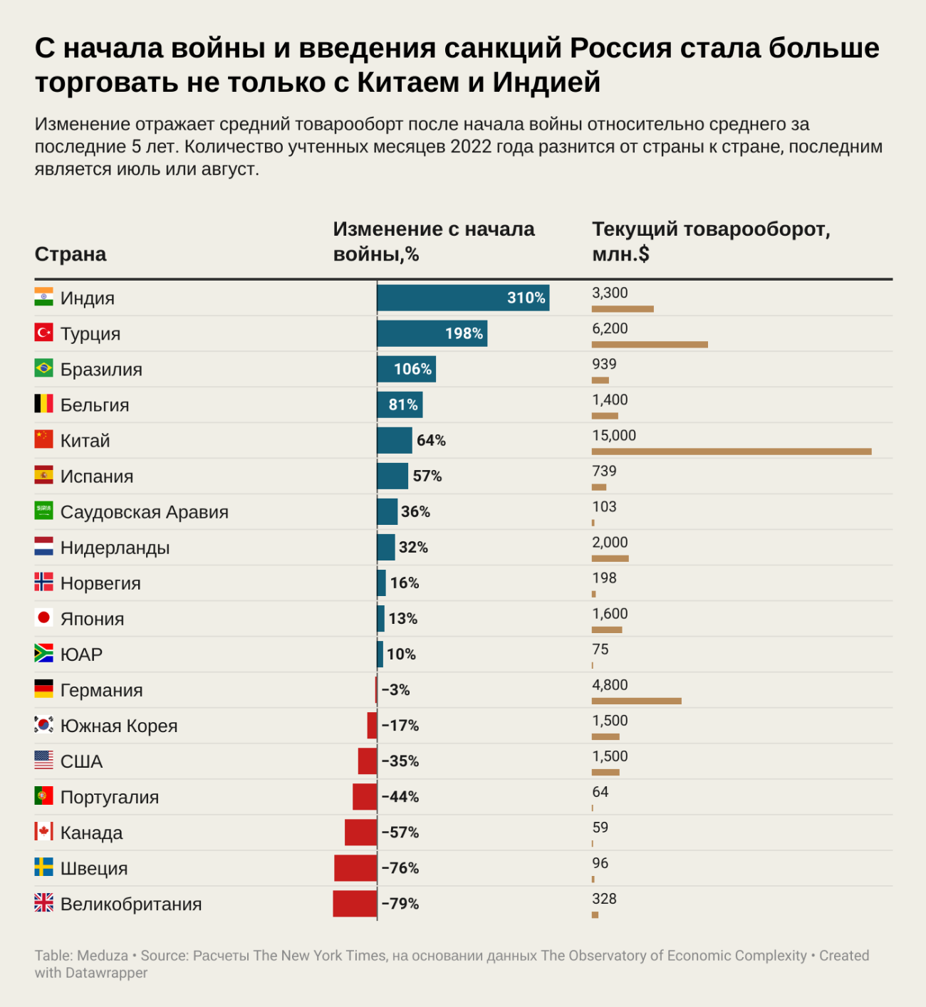 The New York Times изучила, как изменился товарооборот России с разными странами мира после начала полномасштабной войны