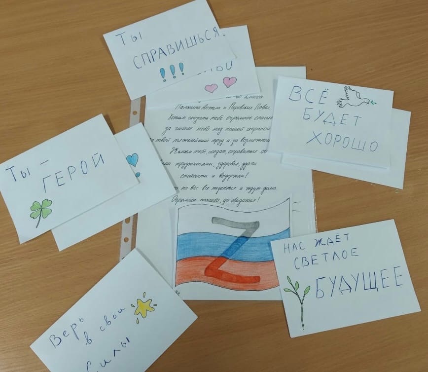 - 19 октября в лицее № 488 снова провели патриотическую акцию — школьников попросили сделать открытки для мобилизованных. На одной из них написано: «Били фашистов в XX веке, разобьем и в XXI».