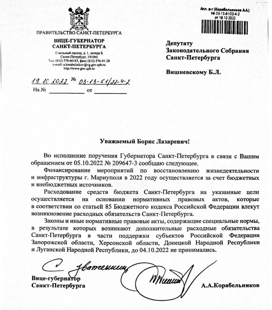 20 октября приходит ответ от «финансового» вице-губернатора Корабельникова, который вынужден подтвердить: никаких законов и иных нормативных актов, возлагающих на Петербург какие-либо расходные обязательства по помощи «новым субъектам», не принималось. И вопрос «откуда деньги на Мариуполь?» становится все более актуальным. Три школы и три детских садика — это как минимум 3‒4 миллиарда рублей. Вряд ли «ответственные бизнесмены» в условиях кризиса могли добровольно пожертвовать такие суммы…