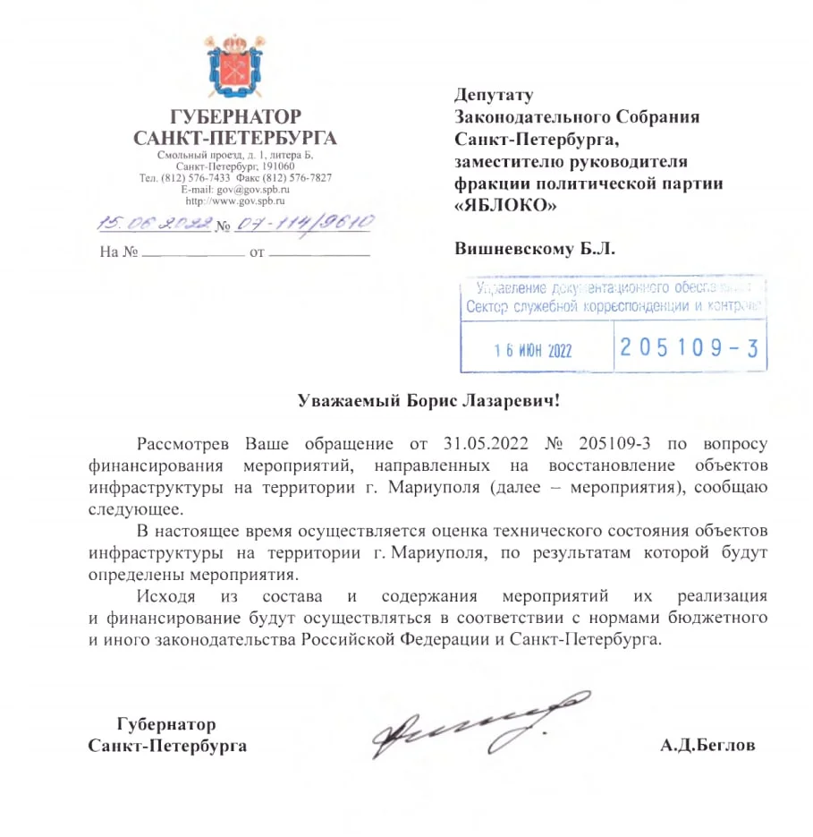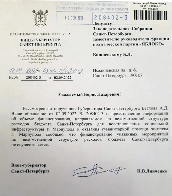 2 сентября я направил губернатору еще один запрос, прося сообщить, выделялись ли в 2022 году средства из бюджета Санкт-Петербурга либо напрямую на восстановление Мариуполя, либо в фонд «Победа», и если выделялись, то в каком объеме и по каким точно статьям бюджета. А если расходы шли из фонда «Победа», то в каком объеме: ведь если губернатор об этом докладывает вице-премьеру, то предполагается, что он как минимум владеет информацией.