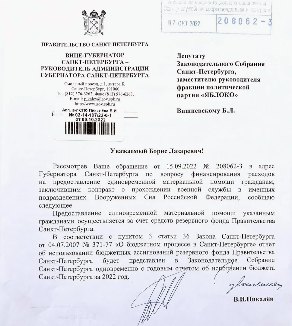 Я направляю губернатору обычное обращение с тем же текстом (это не требует утверждения в парламенте) и 7 октября наконец получаю ответ: выплаты финансируются из Резервного фонда. Что и требовалось доказать.