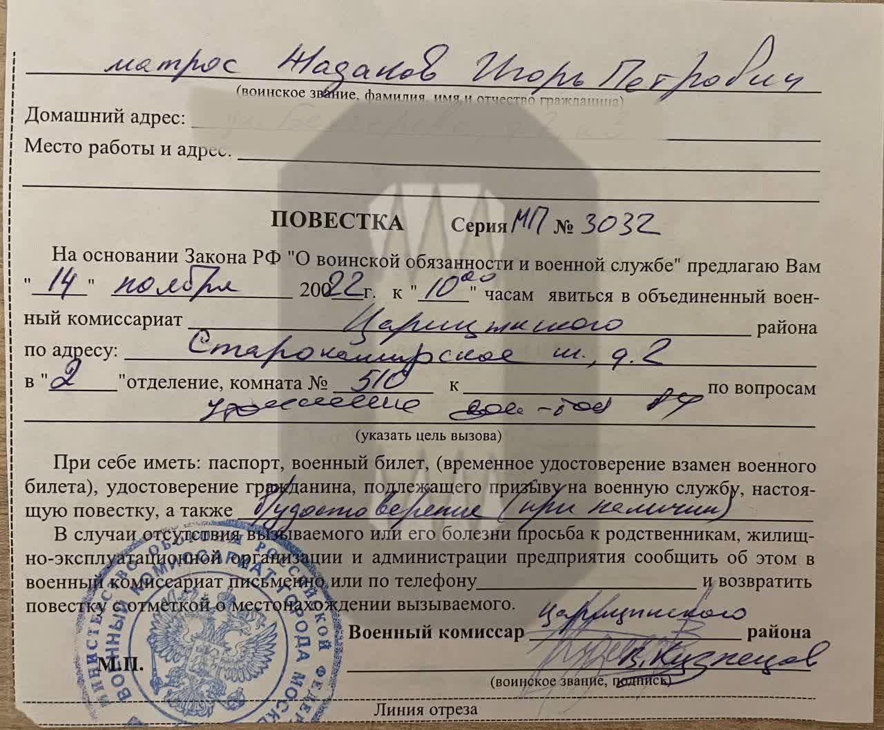 7 москвичей в сентябре получили повестки, но их технические специальности не понадобились военным частям. В Царицыно им вписали специальность "стрелок" и выдали новые повестки на разные даты. По словам мобилизованных, в военкомате им говорят, что мобилизация не окончена, потому что нет указа об этом. Все это время мужчины не могут вернуться к обычной жизни и выйти на прежнюю работу.