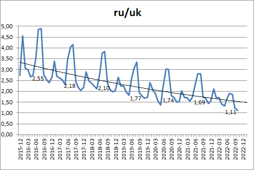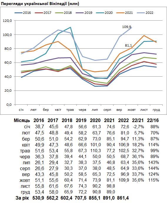 В Украине в октябре 2021 года российскую Википедию просматривали в 1,69 раз чаще украинской, в октябре 2022 - лишь в 1,11 раза чаще. Это также рекордное значение.