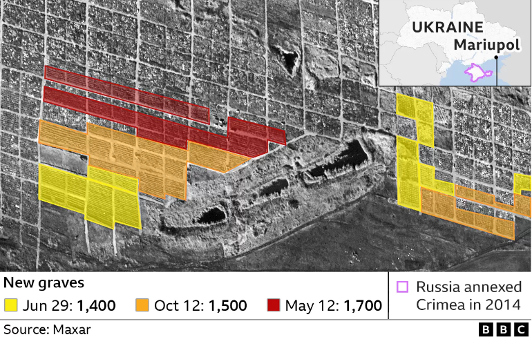 Центр информационной устойчивости проанализировал снимки из Старого Крыма для программы BBC Panorama и пришел к выводу, что с момента последнего анализа изображений в июне здесь было выкопано 1500 новых могил. Сейчас, по оценкам Центра, на этом месте выкопано более 4600 могил, хотя определить точно, сколько людей здесь похоронено, невозможно.