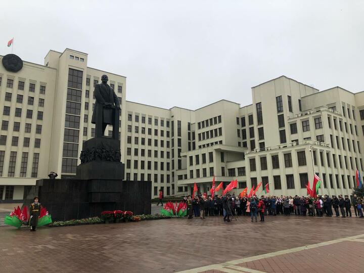 Утром 7 ноября коммунисты Беларуси устроили торжественный митинг и возложили цветы у памятника Ленина на площади Независимости в Минске в честь 105-летней годовщины Октябрьской революции.