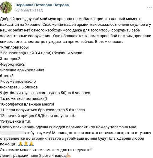 Депутатка «Единой России» Вероника Потапова-Петрова написала на своей странице во «ВКонтакте», что она организовала сбор средств на вещи для роты ее мужа. На публикацию обратила внимание «Ротонда», сейчас пост уже удален.