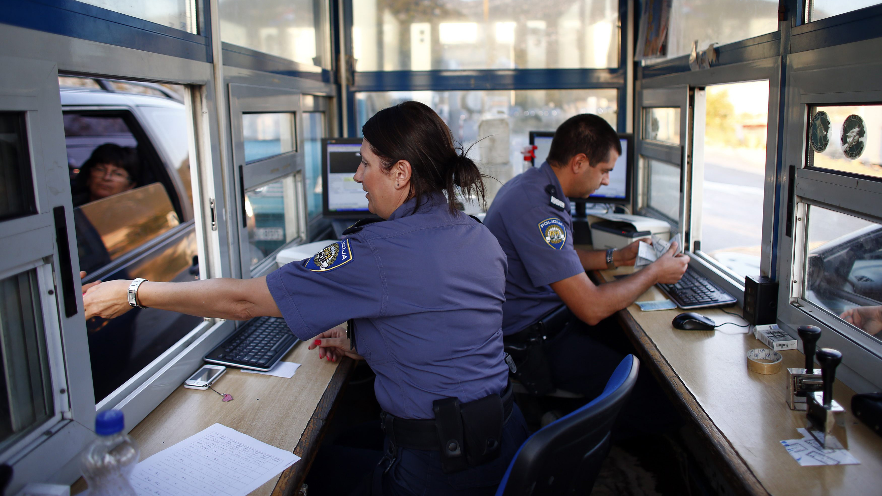Полицейские на паспортном контроле на границе Хорватии. Август 2012 года