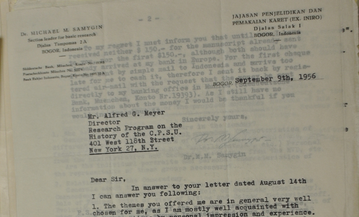По приглашению индонезийского правительства Самыгин стал начальником отдела Института исследования каучука неподалеку от Джакарты. Тем не менее, сначала он не сдался и продолжал свои исторические изыскания, по-прежнему писал американским профессорам, желая продолжить работу над "Историей коммунизма", и даже благодаря протекции Бориса Николаевского, который, хотя и писал, что все обобщения, которые делает Самыгин, никуда не годятся, но тот мемуаристский субстрат, который есть в его работах, интересен, поэтому мемуарные очерки ему можно заказывать. Такие очерки действительно Самыгина попросили написать, но в итоге ему удалось закончить лишь один из этих очерков под названием "Террор в Академии наук", посвященный репрессиям конца 30-х годов. Обещал он прислать и другие, но вместо этого спустя полгода прислал письмо с извинениями, из которого следовало, что Самыгина перевели из-под Джакарты на остров Суматра и там у него гораздо меньше возможностей для исторической работы. Объясняется это, помимо прочего, тем, что в то время на Суматре шла гражданская война, были активны исламистские сепаратисты и город, в котором он жил, несколько раз подвергался обстрелам, то есть, было не до исторических работ.