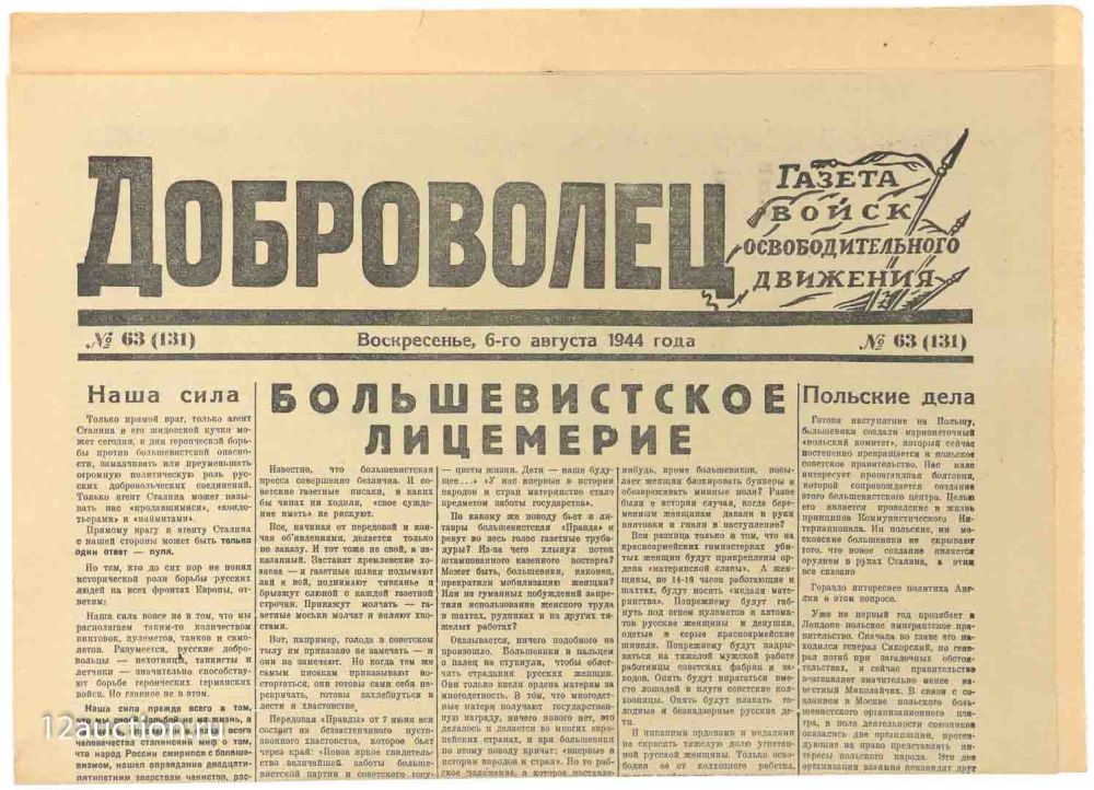 Всего Самыгин проработал в редакции полтора года, причем с ноября 1943-го по начало июня 1944 года он даже фигурировал в выходных данных как заместитель ответственного редактора "Добровольца" под псевдонимом Муромцев. У сотрудников редакции было множество псевдонимов, и далеко не все они раскрыты. Всего он опубликовал как минимум 40 статей, а, наверное, гораздо больше, на самые разнообразные темы: "Как внушали вражду к Германии", "Правда о Сталине", "Внутренние затруднения Англии" и биографические статьи о самых разных исторических лицах – о Клаузевице, о Пушкине, о Брамсе, даже о Чернышевском. Последняя вызвала волнения, особенно в монархических кругах и примыкающих к ним кругах русской эмиграции.