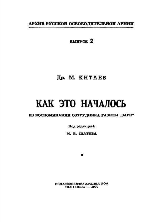 Параллельно с существованием Института в Мюнхене, Самыгин закончил свои воспоминания "Русское освободительное движение". Как и все его последующие мемуарные и публицистические работы, подписаны они новым псевдонимом, которого во время войны не было, – М. Китаев. В этих воспоминаниях он довольно резко прошелся и по генералу Власову, и по другим высокопоставленным деятелям Русской освободительной армии. Процитирую, чтобы дать вам представление о тех абзацах, которые были впоследствии в издании 1970 года вымараны: