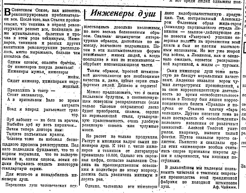 "Состряпанный Александром Фадеевым образ жида-героя успешно совершал подвиги на протяжении всей книги и был неплохим выставочным экспонатом, но вот уже второй год войны Левинсон, как и следовало ожидать, остается раскрашенной картинкой, а жиды – трусами".