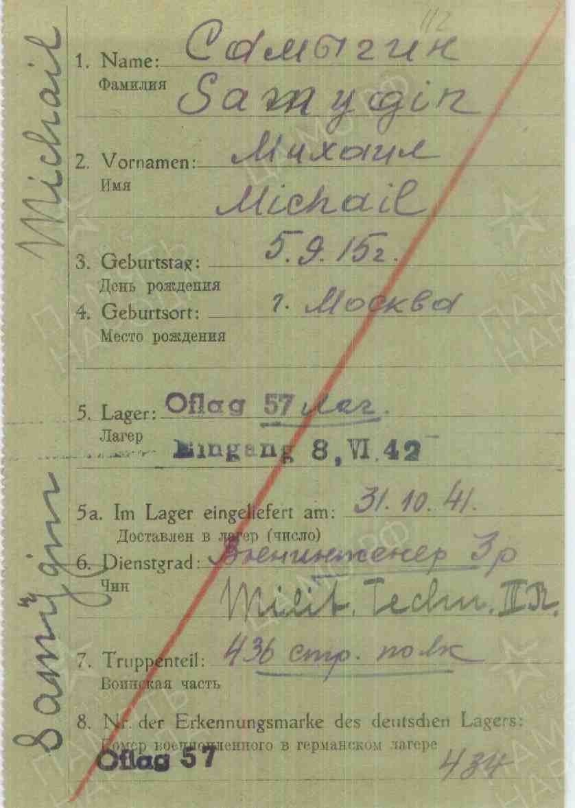 Возвратимся к Михаилу Самыгину. Его перевели после недолгого пребывания в Бобруйске в так называемый Офлаг-57 в Белостоке и сам он впоследствии вспоминал, что "в лагере в Бобруйске умерло сравнительно немного, во всяком случае, о процентах говорить еще не приходилось. Действовал запас мирного времени, позволивший многим из нас, даже людям далеко не выдающимся в смысле физической силы, перенести плен. В лагере Белосток за зиму 1941-42 года умерло около 30 процентов людей. Основной причиной смерти были тиф и желудочные заболевания. В конечном счете это были, конечно, смерти от голода, так как не всякий организм был способен вынести подобное испытание". И сам Самыгин тоже переболел тифом, после чего по собственным словам "оглох, почти ослеп и на продолжительное время потерял память".
