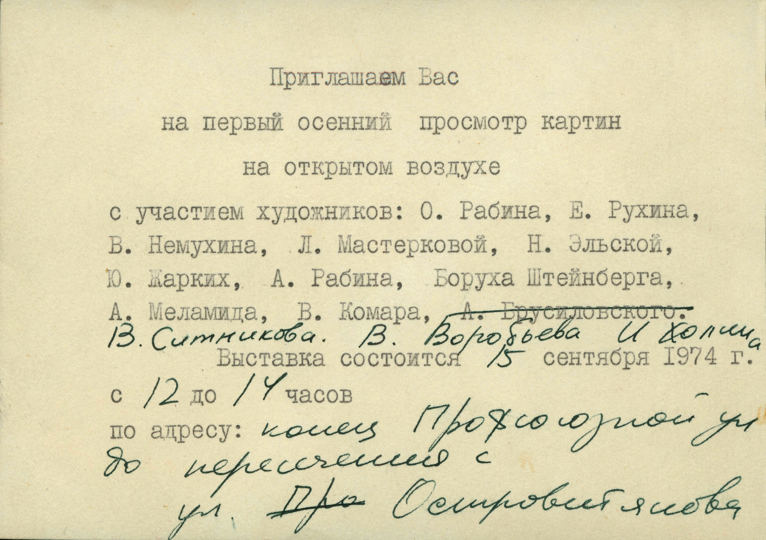 ”Бульдозерная выставка" стала кульминацией истории неофициального искусства. 15 сентября 1974 года в московском парке Беляево власти уничтожили работы многих художников, включая работы Оскара Рабина, Лидии Мастерковой, Евгения Рухина, Владимира Немухина, Александра Меламида и мои. Сегодня мало кто может вообразить сенсационный поток мировой прессы, вызванный этим скандалом”.