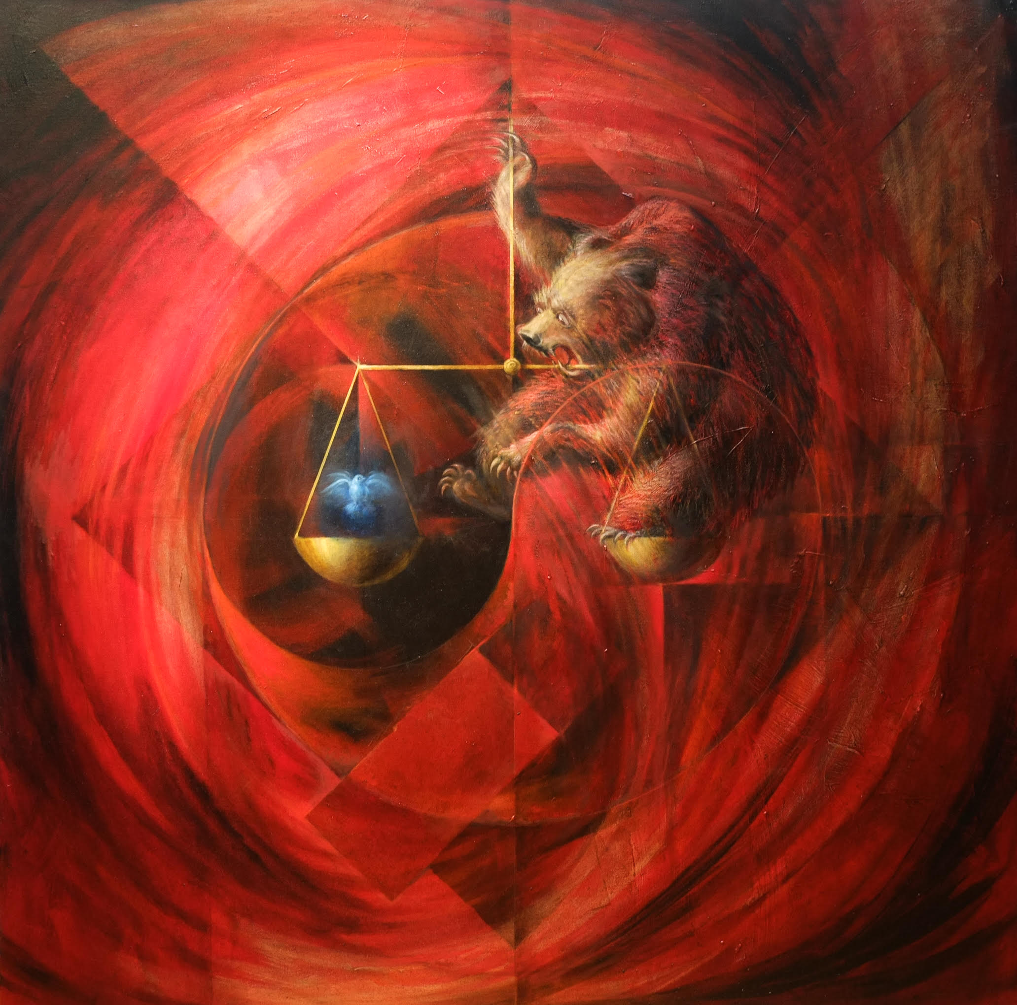 Виталий Комар: То, что и есть сегодня на моем мольберте. Я рассказывал вам о работе, которую я выставил, ее отобрали на Киевскую биеннале, это было несколько лет назад, но я продолжал работать над ней. Там такая идея: медведь атакует некие границы "Инь-Ян", идет атака на "Инь-Ян". И там есть несколько символов, есть символ социального равновесия – это весы, символ суда, правосудия и символ вселенского равновесия – это "Инь-Ян". Я объединяю эти символы и трактую эти линии как именно что границы.