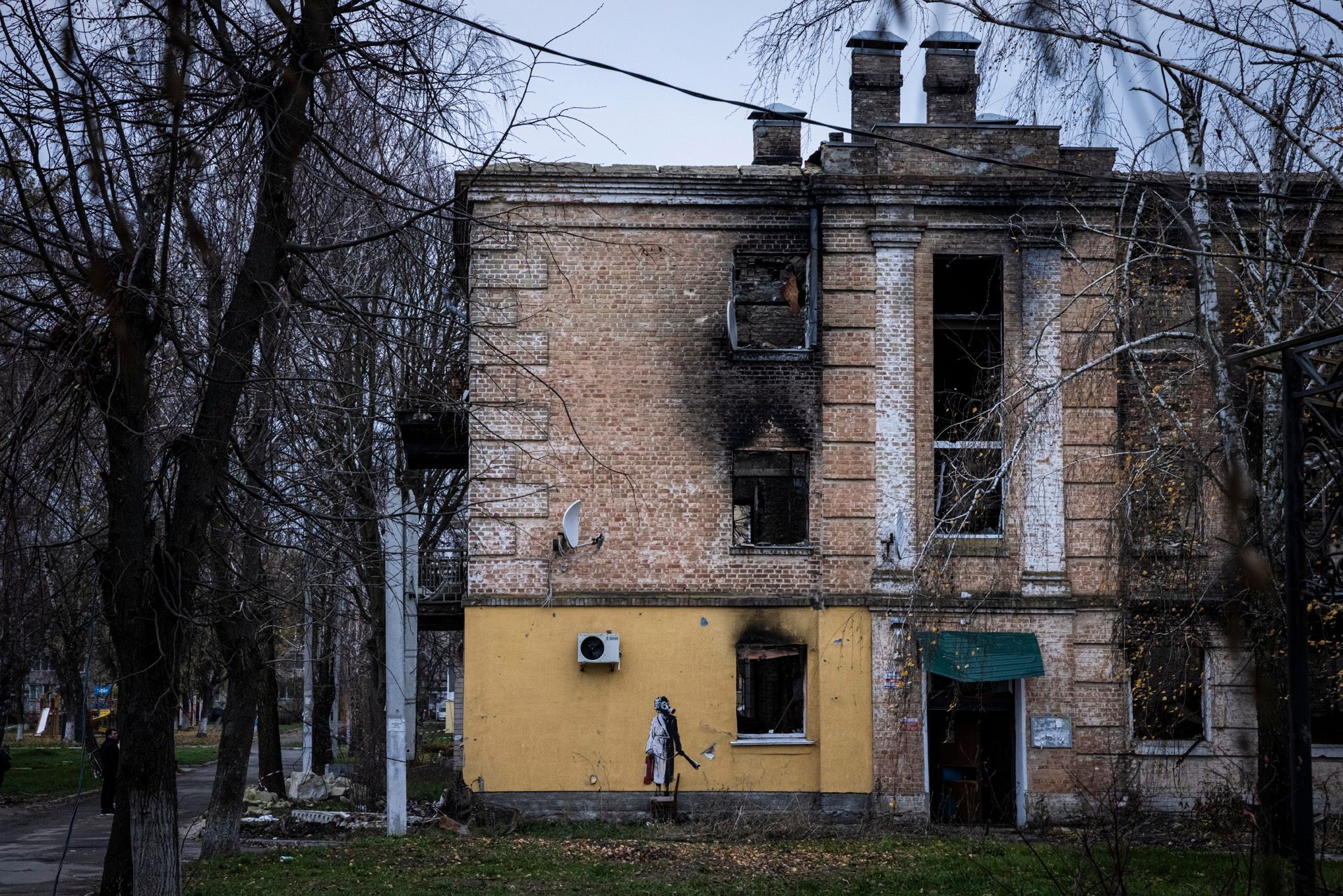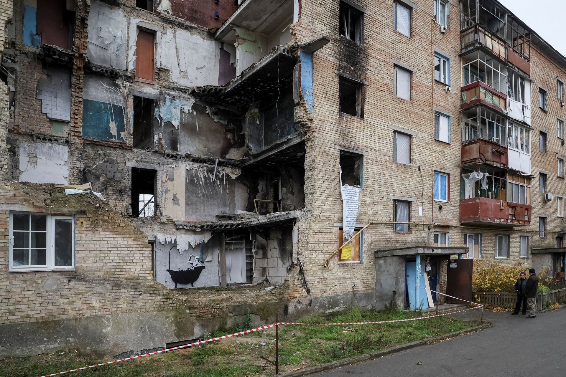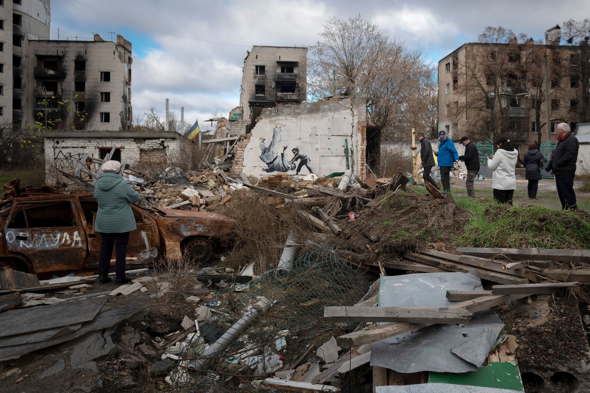Граффити Бэнкси на стене разрушенного здания в городе Гостомеле в Бучанском районе Киевской области. 13 ноября 2022 года. Gleb Garanich / Reuters / Scanpix / LETA