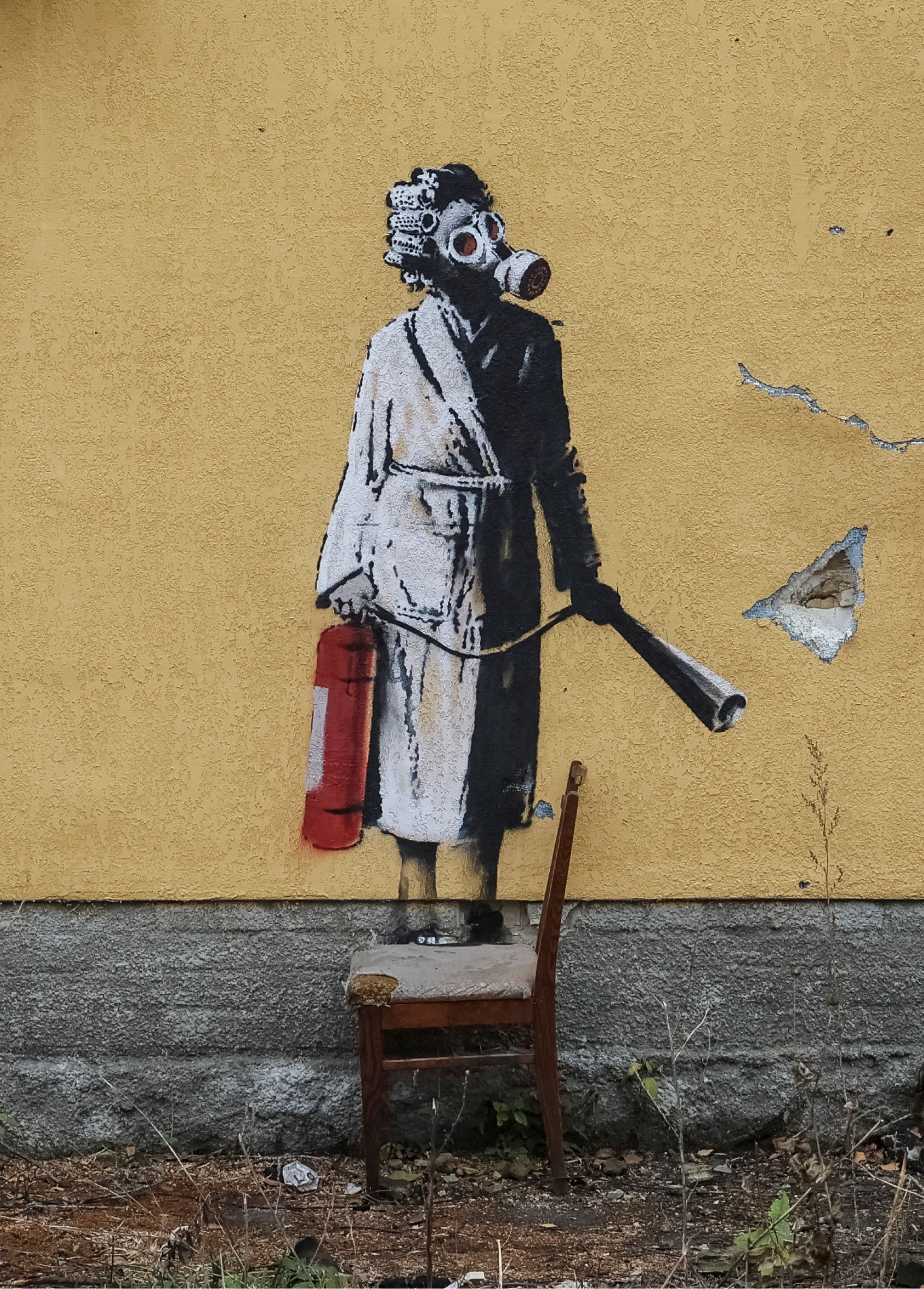 Ed Ram / Getty Images Киев. Майдан Незалежности. На граффити дети качаются на стоящем рядом противотанковом еже как на качеляхAndrew Kravchenko / AP / Scanpix / LETA Бородянка. На граффити ребенок побеждает в спарринге мужчину в форме для восточных единоборствSergey Dolzhenko / EPA / Scanpix / LETA Бородянка. На граффити гимнастка стоит на рукахAndrew Kravchenko / AP / Scanpix / LETA Ирпень. На граффити гимнастка с лентойGleb Garanich / Reuters / Scanpix / LETA Горенка. На граффити бородатый мужчина принимает ваннуRoman Pilipey / EPA / Scanpix / LETA Киев. На граффити бронированный грузовик с ядерной боеголовкой в форме пениса. Изображение пениса, вероятно, появилось до БэнксиEd Ram / Getty Images Гостомель. На граффити женщина в халате с огнетушителем и в противогазе. Работа появилась на доме недалеко от аэропорта Антонов