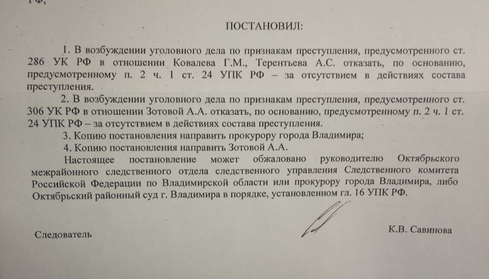 Следственный комитет вынес постановление об отказе в возбуждении уголовного дела в отношении сотрудника центра «Э», майора Александра Терентьева, угрожавшего сексуальным насилием жительнице Владимира Алёне Зотовой, задержанной недалеко от места проведения митинга против мобилизации в центре города. Зотова требовала привлечь силовика к уголовной ответственности по статье о злоупотреблении должностными полномочиями. Документ имеется в распоряжении «Довода».