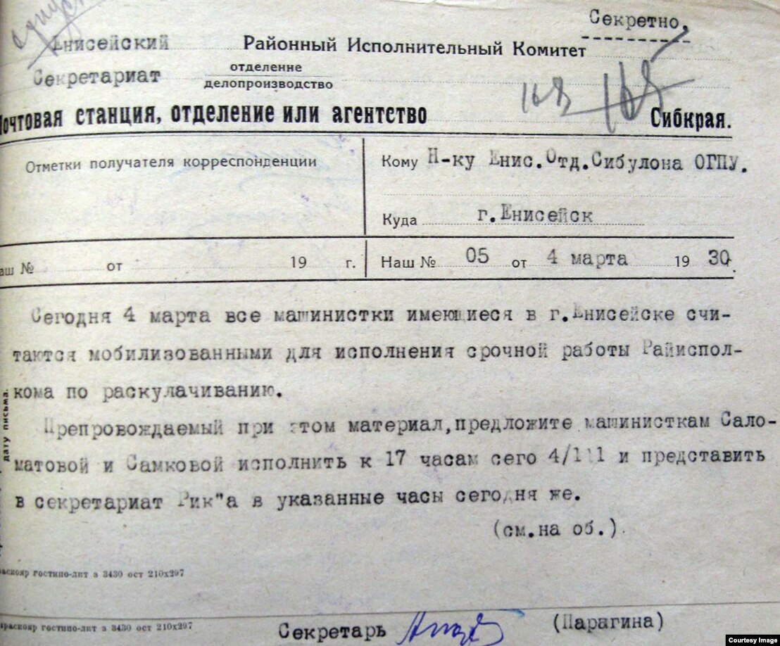 – Интересный документ я обнаружил в Енисейском районном архиве – переписка исполкома, который решал вопрос, как срочно напечатать списки "лишенцев". Были разосланы директивы, собрать всех машинисток города Енисейска для печати секретных документов. По дате это было как раз тогда, когда собиралась "тройка" по выселению кулаков. Я работал с этими списками, их действительно одной машинистке было сложно напечатать. По всей видимости, собрали со всего района, и они стучали с утра до ночи, – рассказывает Алексей Бабий.
