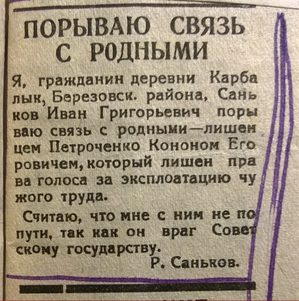 При этом советская власть "гуманно" предлагала родственникам лишенных прав решение "проблемы", которую сама и создавала, – публично отречься от своих родных. Немало людей, судя по газетным объявлениям начала 1930-х годов, воспользовалось таким "правом". Районная и областная пресса пестрела объявлениями о "разрыве связей". В том числе от девушек из бедных семей, нашедших состоятельных мужей и вдруг обнаруживших, что их социальный лифт стремительно падает на самое дно советского общества.