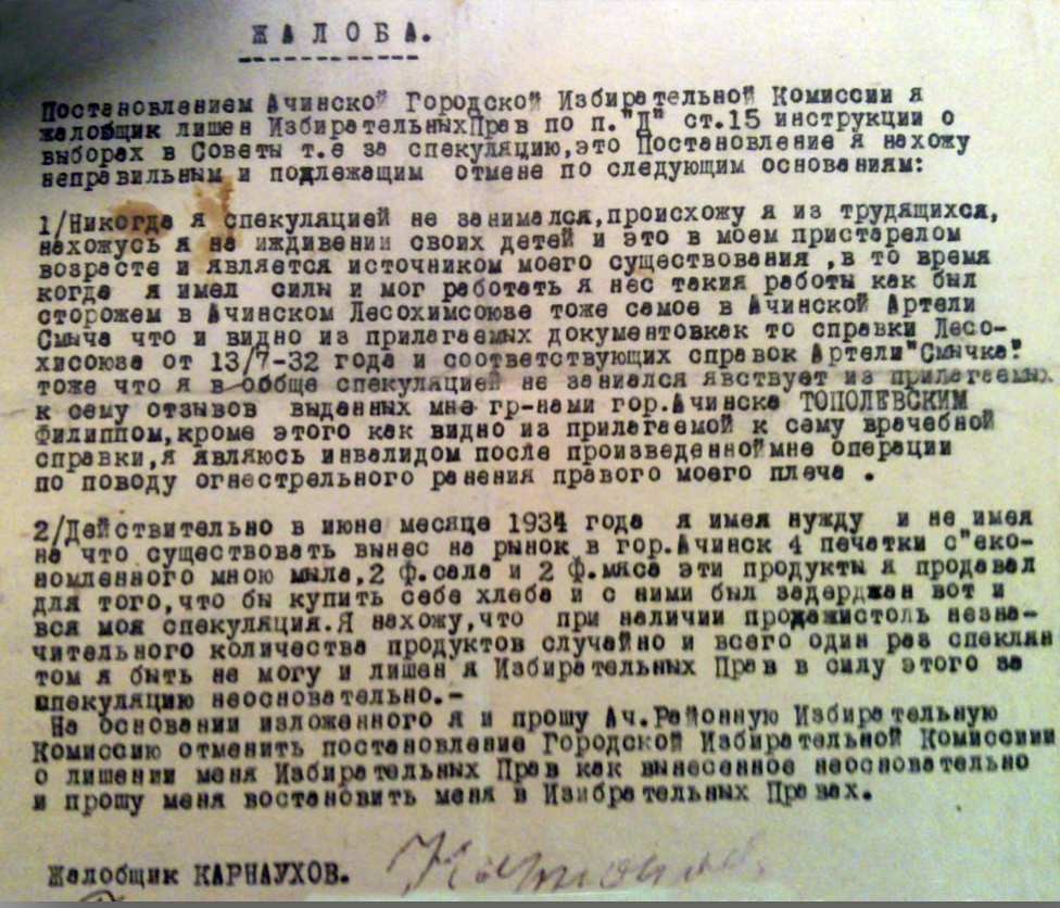 "Действительно в июне месяце 1934 года я имел нужду и не имеяя на что существовать вынес на рынок в гор. Ачинск 4 печатки с”економленного мною мыла, 2 ф. сала и 2 ф. мяса. Эти продукты я продавал для того что бы купить себе хлеба и с ними был задержан вот и вся моя спекуляция. Я нахожу, что при наличии продажи столь незначительного количества продуктов случайно и всего один раз спекулянтом быть не могу и лишен я Избирательных прав в силу этого за спекуляцию неосновательно." Жалобщик Карнаухов.