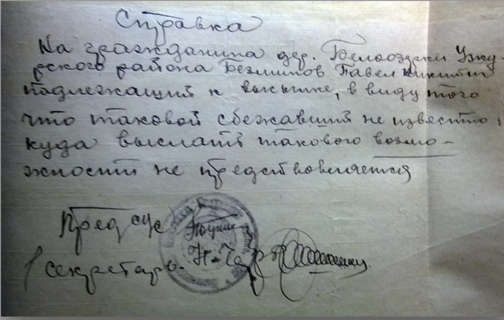 – При высылке возникало множество коллизий. Например, глава семьи сбежал, жена на девятом месяце беременности, по инструкции высылать нельзя. Райисполком принимает решение: высылку отложить до родов, после родов – выслать со всеми детьми. Другой пример: высылаемый глава семьи пошел "в район" искать правды, дома остались только дети. Что делать, высылать ли детей? Решение райисполкома: "Если мать на месте, выслать с матерью, если нет – не высылать". Или вот справка из сельсовета: "… Ввиду того, что таковой сбежавший не известно куда, выслать такового возможности не представляется…", – рассказывает Алексей Бабий. – На перемещение выселяемых выделялись небольшие средства, поэтому в Сибири высылали обычно не дальше соседнего района. Сама по себе транспортировка большого количества людей, их расселение, обеспечение минимальных бытовых условий по тем временам было нерядовой операцией, в процессе которой погибло и пострадало множество людей. Например, в Назаровском районе была лишена прав и выслана семья И. Н. Андреева, которая жила в Березовке: муж, жена, дети: Василий, Алексей, Евдокия, Клавдия, Николай, бабушка. Если сравнить посемейный список при выселении с учетными данными, видно, что из четверых несовершеннолетних детей до места ссылки доехала только Евдокия. Василий, Алексей, Клавдия в учетной карточке уже не значатся. Вероятно, они погибли в дороге.