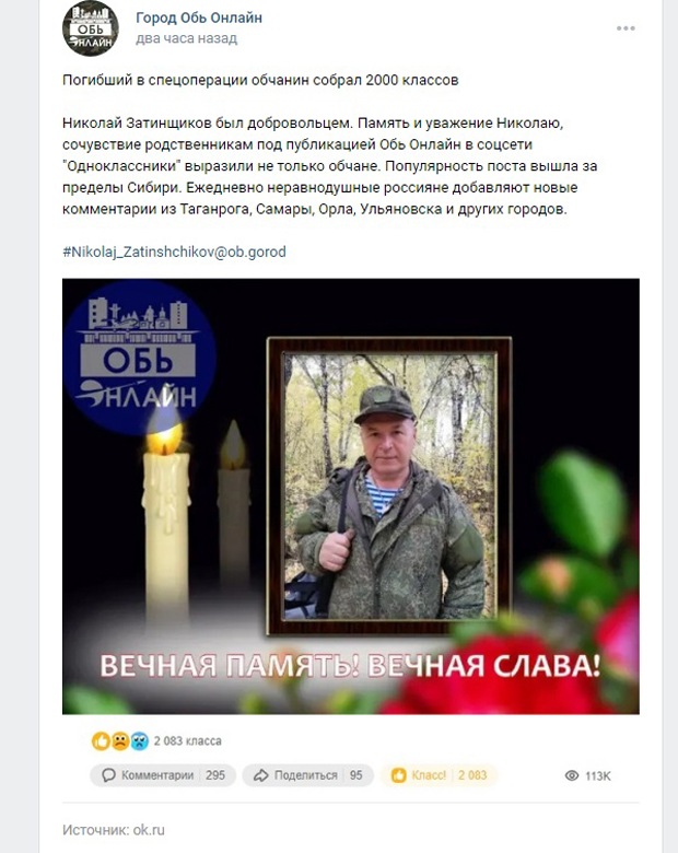 11:24 Крупнейший паблик города Обь Новосибирской области объявил, что их новость о гибели добровольца собрала «2000 классов» в «Одноклассниках».