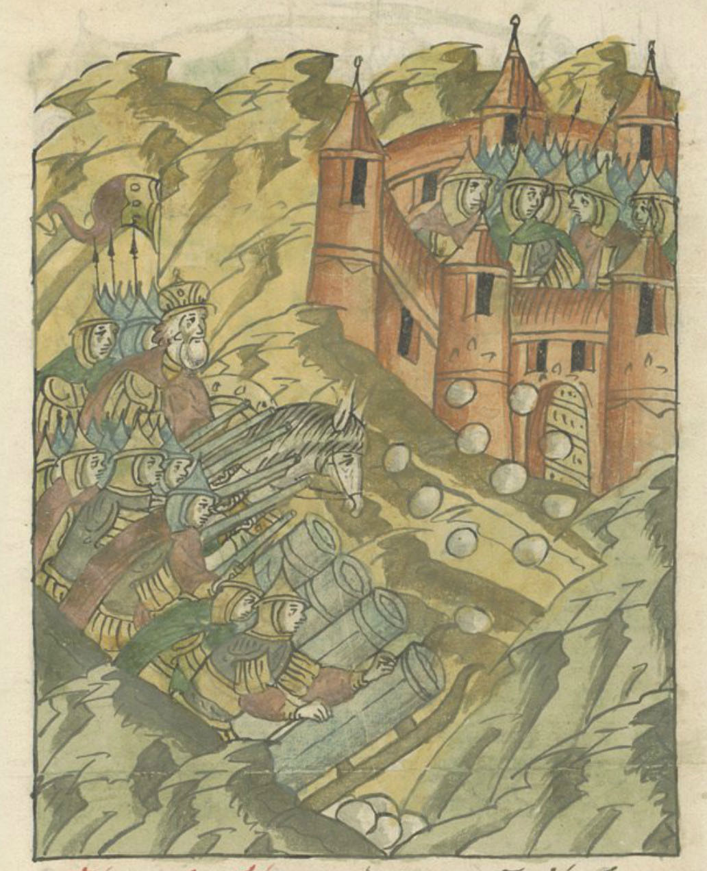 Бомбардировка Смоленска московским войском в 1514 году. Миниатюра Лицевого летописного свода XVI века. Источник wikimedia.org