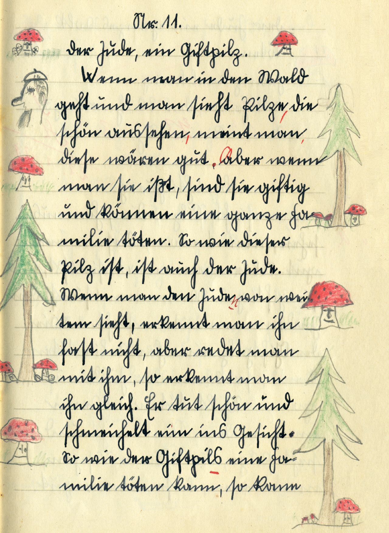 Вероятно, он не придумал это сам. Скорее всего, это было изложение рассказа, который им читали в классе, — истории из детской книжки «Ядовитый гриб», опубликованной антисемитской газетой Der Stürmer. Но моему дяде тогда было 12. Я думаю, в этом возрасте ты уже что-то понимаешь. Если бы мои бабушка и дедушка были более осведомленными, они бы воспитали дядю так, что он даже в 12 понимал бы, что евреи не похожи на «ядовитые грибы» и такая риторика опасна.