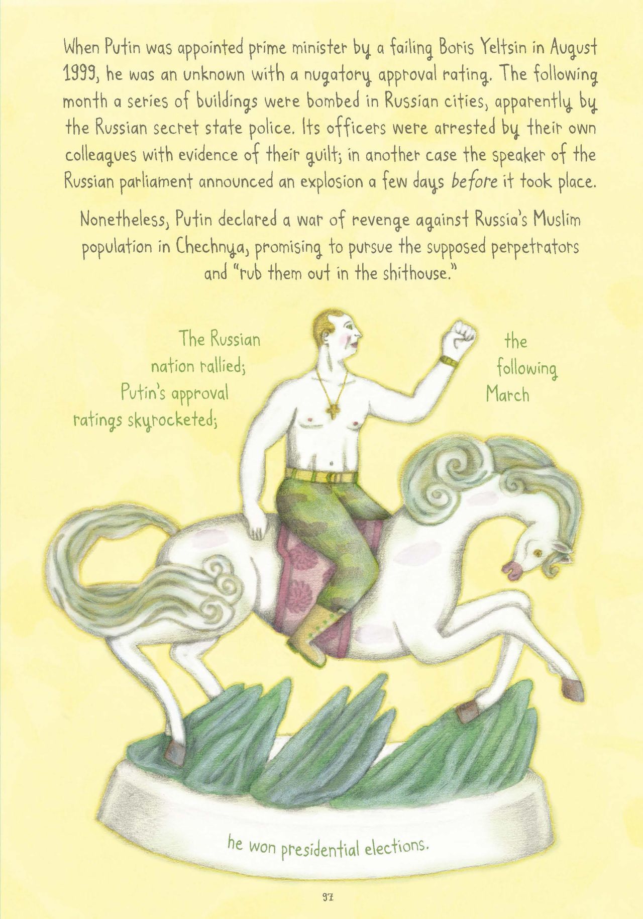 — Тогда я не так хорошо была знакома с российской политикой, поэтому мне сложнее всего было иллюстрировать эту главу. Я думала, как создать впечатляющее изображение Путина, которое бы выглядело пропагандистски. Я нарисовала российского президента — на лошади и с оголенным торсом — в качестве фарфоровой фигурки. В социалистическом Китае популярны такие сувениры, которые льстят тщеславию лидера и изображают его в идеализированном виде. Но все это из фарфора, поэтому может быть легко разбито.