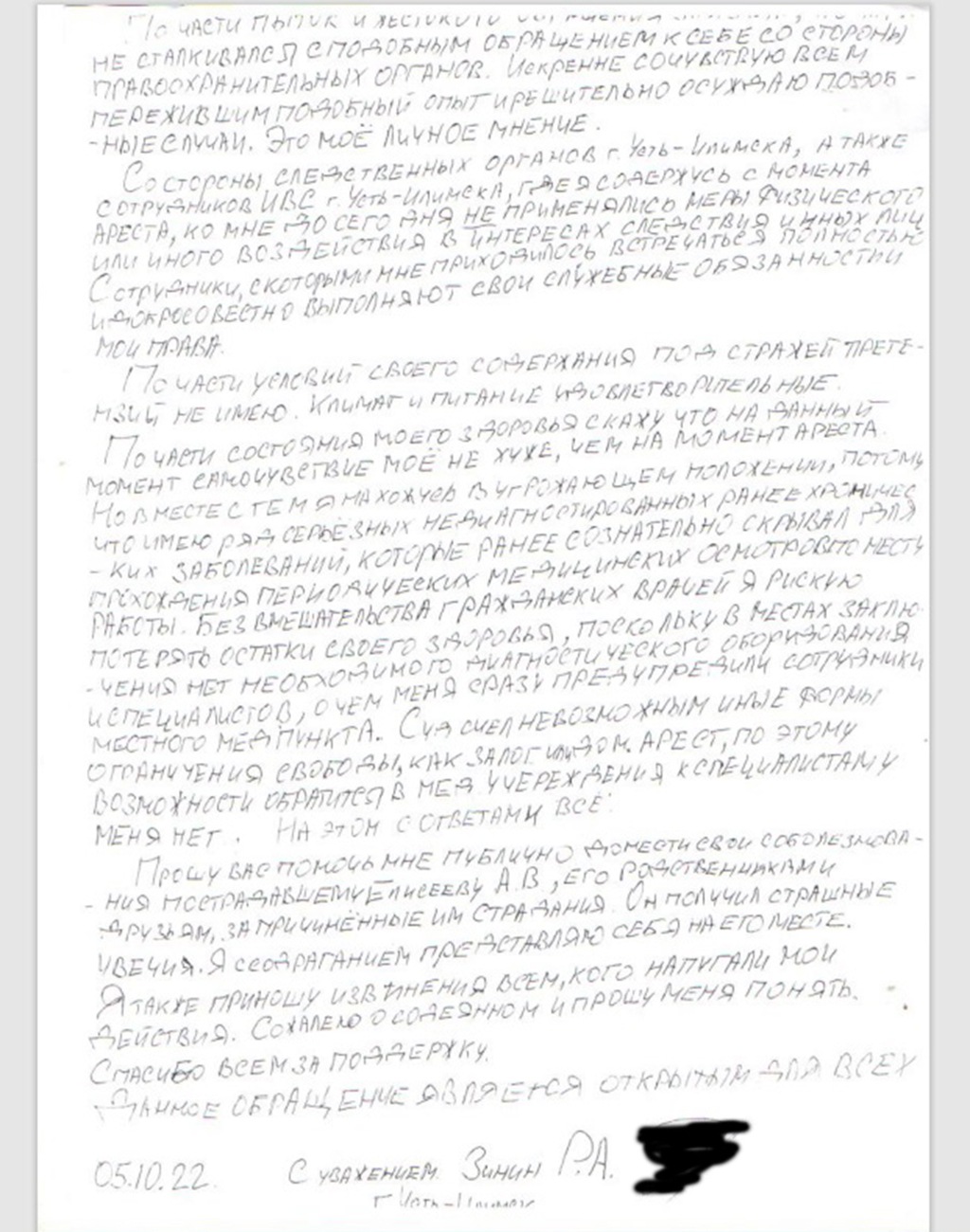 Знакомые матери Руслана Зинина прислали Тайге.инфо письмо Зинина из СИЗО. Его мама Марина Зинина подтвердила редакции подлинность обращения.
