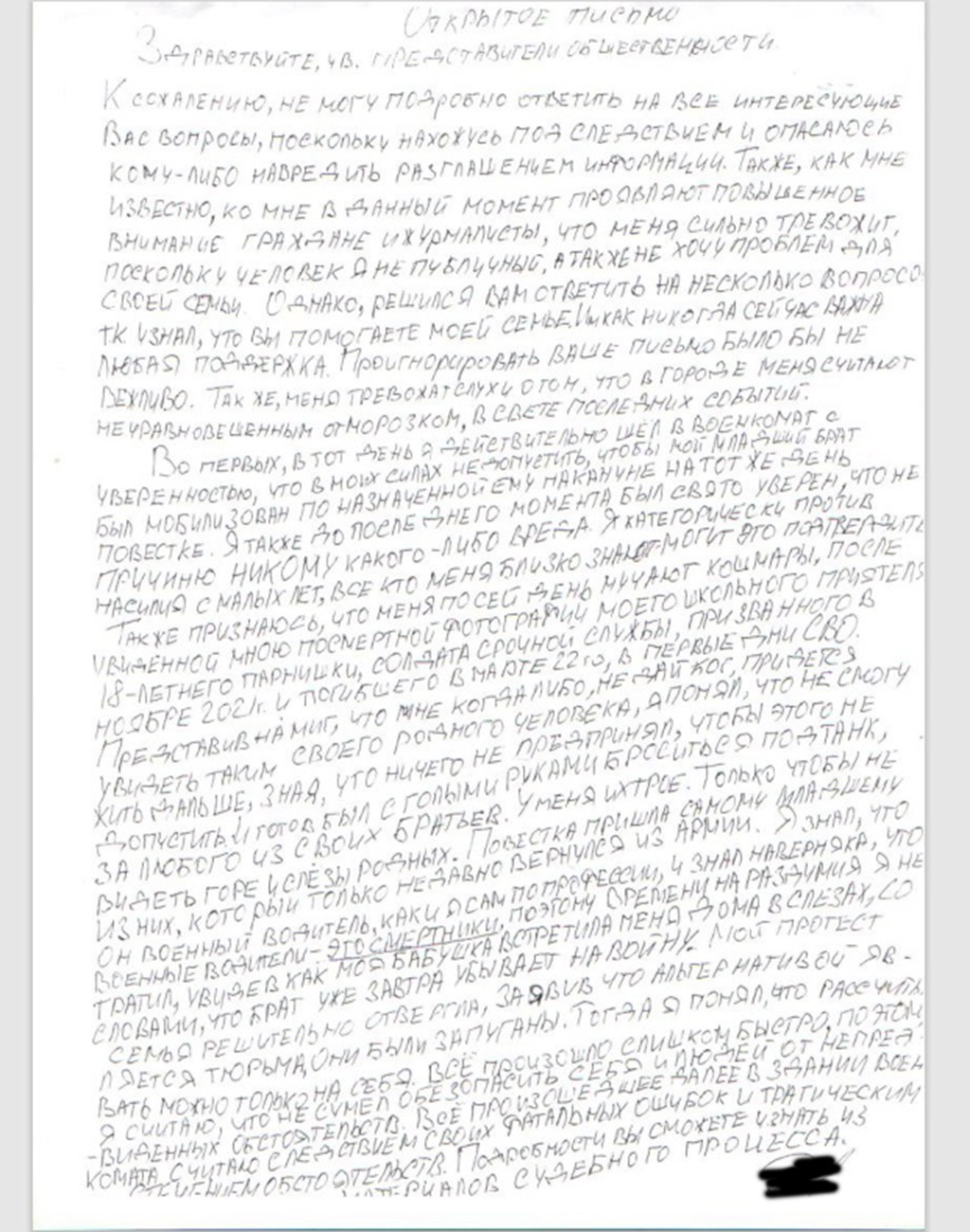 «В тот день [26 сентября] я действительно шел в военкомат с уверенностью, что в моих силах не допустить, чтобы мой младший брат был мобилизован по назначенной ему накануне на тот же день повестке. Я также до последнего момента был свято уверен, что не причиню никому какого-либо вреда. Я категорически против насилия с малых лет, все кто меня близко знают, могут это подтвердить», — сказано в письме.