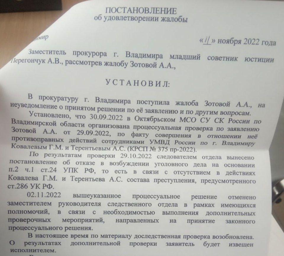 Прокуратура Владимирской области посчитала неправомерным отказ в возбуждении уголовного дела в отношении силовиков Александра Терентьева и Г. Ковалева.