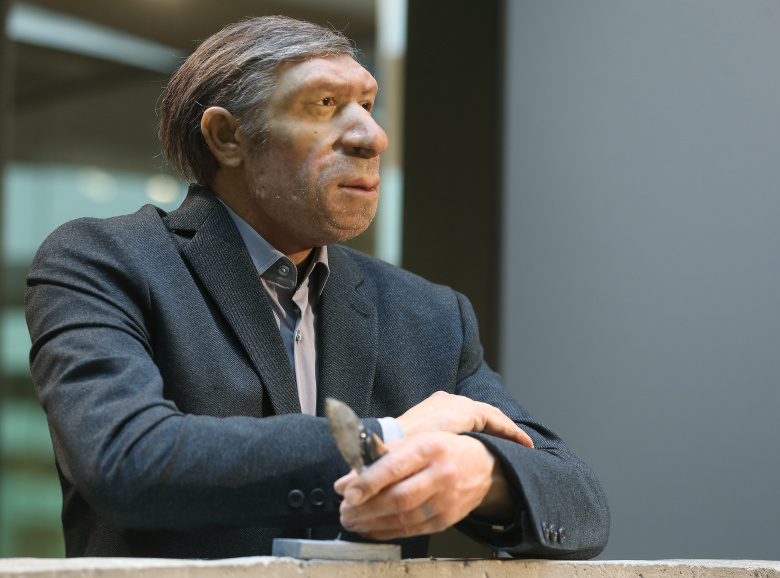 Эффективный менеджер: анатомически точная восковая фигура неандертальца, одетого в современный костюм (но с каменным ножом в руке), в Неандертальском музее (Меттман, Германия). Имя персонажа — «Мистер Четыре процента»: именно такова максимальная доля неандертальских генов в геноме современного человека.