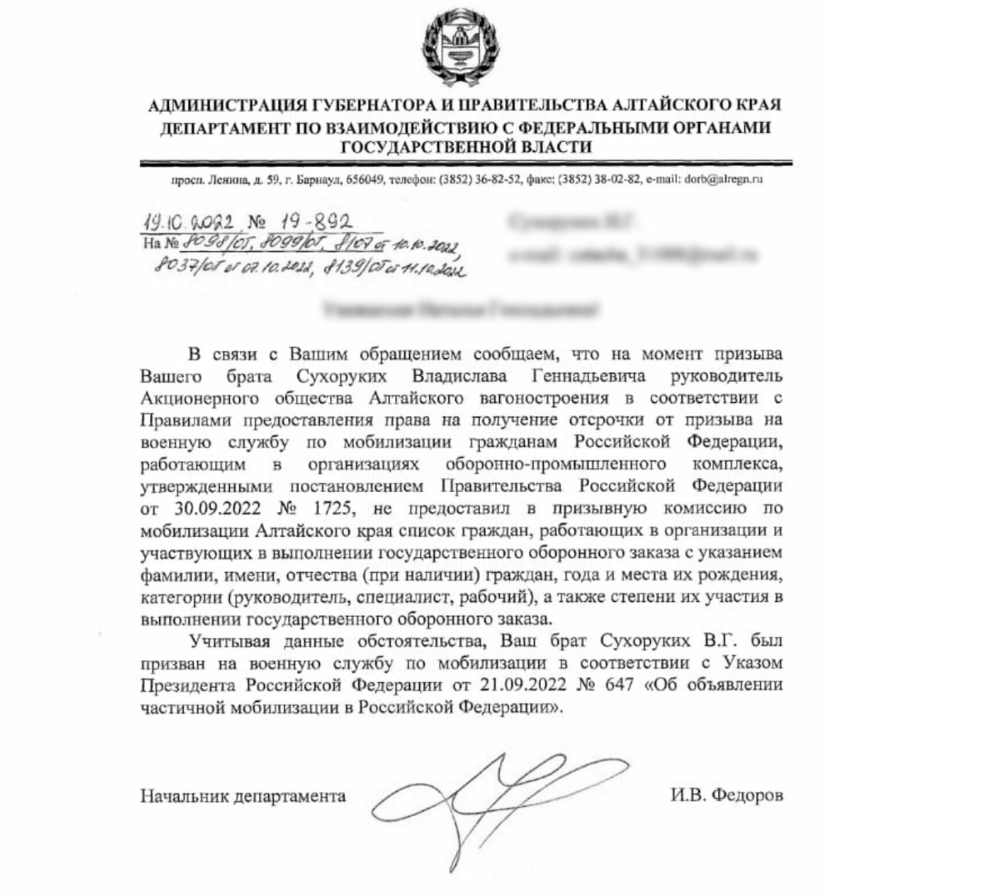 29 сентября "Алтайвагон" внесли в реестр предприятий ОПК. После этого Наталья Сухоруких написала обращения с требованием вернуть брата во многие инстанции: от приемной президента России до военной прокуратуры и администрации Алтайского края.