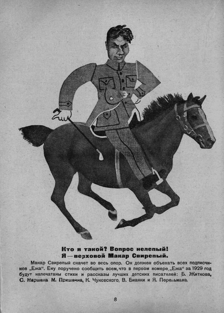 В 11-м номере за 1928 год был помещен портрет Олейникова на лошади в образе Макара Свирепого. Далее следовал рекламный текст и олейниковское стихотворение: