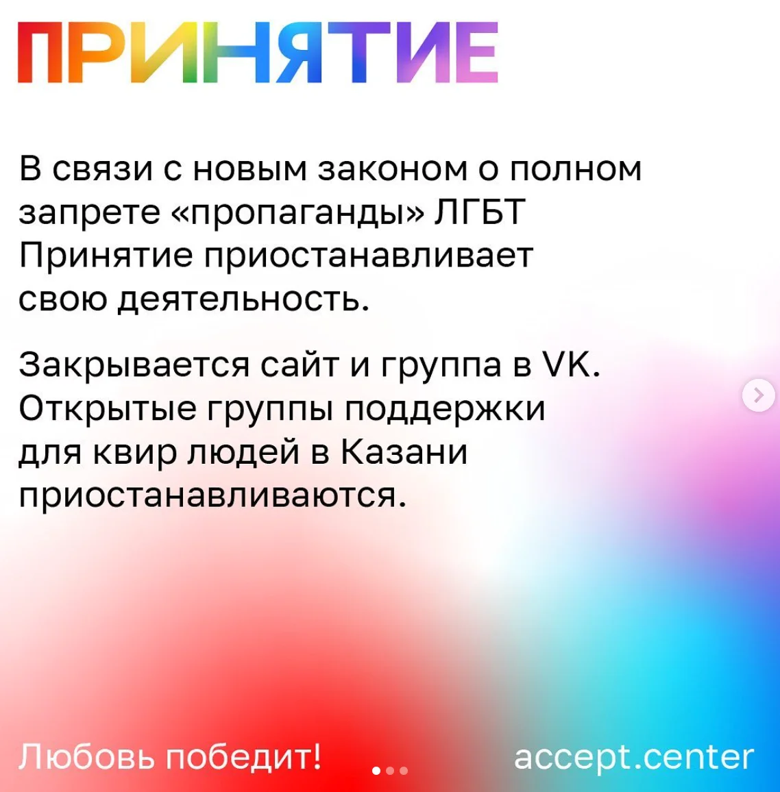 «В связи с новым законом о полном запрете "пропаганды" ЛГБТ "Принятие" приостанавливает свою деятельность. Закрывается сайт и группа поддержки VK. Открытые группы поддержки для квир-людей в Казани приостанавливаются», — говорится в сообщении.