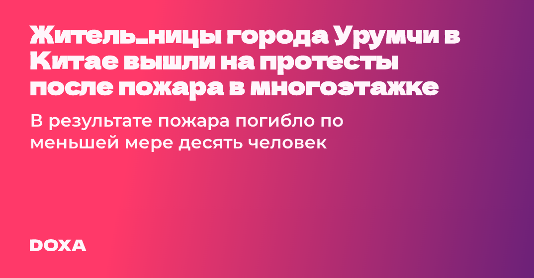 В Урумчи, административном центре провинции Синьцзян, проходят протесты против карантинных ограничений из-за коронавируса. По сообщению Financial Times, протесты вспыхнули после пожара в многоэтажном доме, где погибло не меньше десяти человек. В соцсетях говорится, что коронавирусные ограничения помешали пожарным и спасатель_ницам добраться до места пожара оперативно.