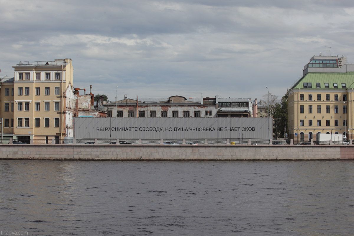 Forty years later, on August 3, 2016, the slogan “You may crucify freedom, but the human soul knows no shackles,” appeared again in St. Petersburg, this time without an exclamation point. Timofey Radya, an artist from Yekaterinburg, left it on the Pirogovskaya Embankment, where it lasted several hours. Rybakov said, “Well, I can only say that it [the inscription] has not lost its relevance. My regards to the new authors.”