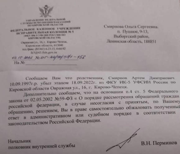 В августе его перевели в кировский изолятор на период карантина, а потом направили в место заключения – ИК №5 города Кирово-Чепецк. 4 сентября он первый и последний раз звонил матери из колонии ИК-5 УФСИН по Кировской области – тогда он собирался писать заявление на условно-досрочное освобождение.